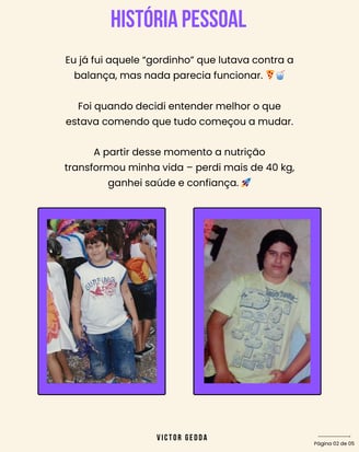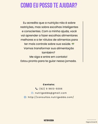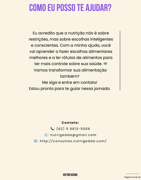 Além das consultas, sou autor(a) de ebooks exclusivos sobre alimentação saudável, emagrecimento sustentável e leitura de rótulos, ajudando você a ter mais autonomia e clareza em suas escolhas alimentares.